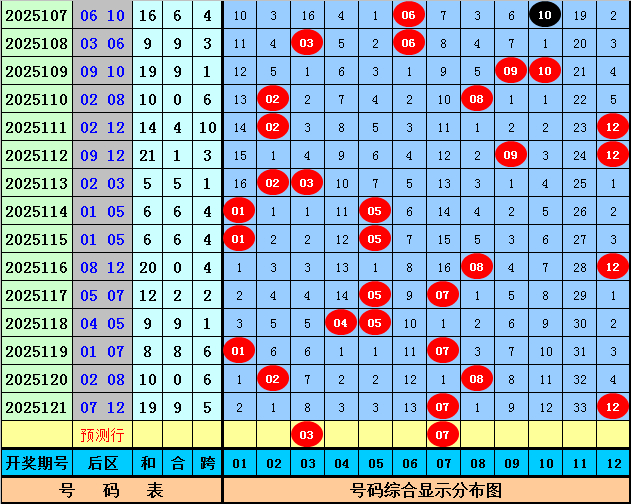 体彩大乐透25121期奖号为02 03 08 13 21 + 07 12,前区号码奇偶比为3:2,012路比为2:1:2,大小比为1:4,后区和值为19,跨度为5。