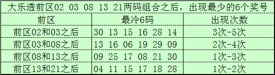 前区两码02和03开出之后,施展最冷的6个号码为:30、13、15、16、28、14; 前区两码03和08开出之后,施展最冷的6个号码为:13、16、06、19、29、09; 前区两码08和13开出之后,施展最冷的6个号码为:09、25、17、08、21、30; 前区两码13和21开出之后,施展最冷的6个号码为:04、11、15、17、18、28; 在以上冷码中,出现1次的号码有:04、06、08、11、14、18、19、21、25、29; 出现2次及以上的号码有:09、13、15、16、17、28、30; 大乐透第25122期前区杀8码参考:05 11 12 14 15 20 21 34。