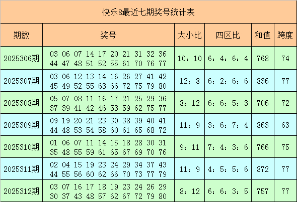 福彩情景8第2025312期开出奖号:03 07 16 17 18 19 23 24 26 29 30 37 43 48 57 62 67 72 79 80,其中奖号大小比为8:12,四区比为6:6:3:5,和值为757,跨度为77。